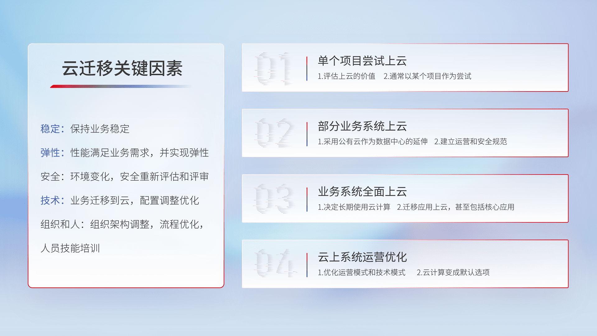 结合实际业务,,,,从规划设计、、、云平台选型、、、、云原生改造、、数据迁移、、集成交付,,,迁移全过程为客户识别最佳上云路径,,,做好风险识别管理,,,,设计网络架构、、、身份权限、、安全审计合规、、操作审计、、、、日志审计、、、、监控告警策略、、、多站点容灾设计等,,对云上基础设施进行整体规划,,,,提升IT治理水平,,,,以满足弹性、、、、高可用、、、高性能的需求。。。。