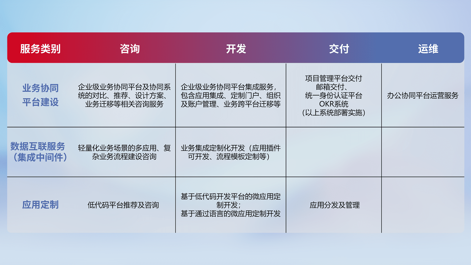 针对钉钉、、、、企微、、IDaas等平台级产品提供产品的规划、、方案、、交付、、、、定制化开发等服务,,,实现如统一协同办公、、、、智能客户服务、、、混合会议管理、、智能数据查询、、、、等业务场景,,,实现数字化转型。。。